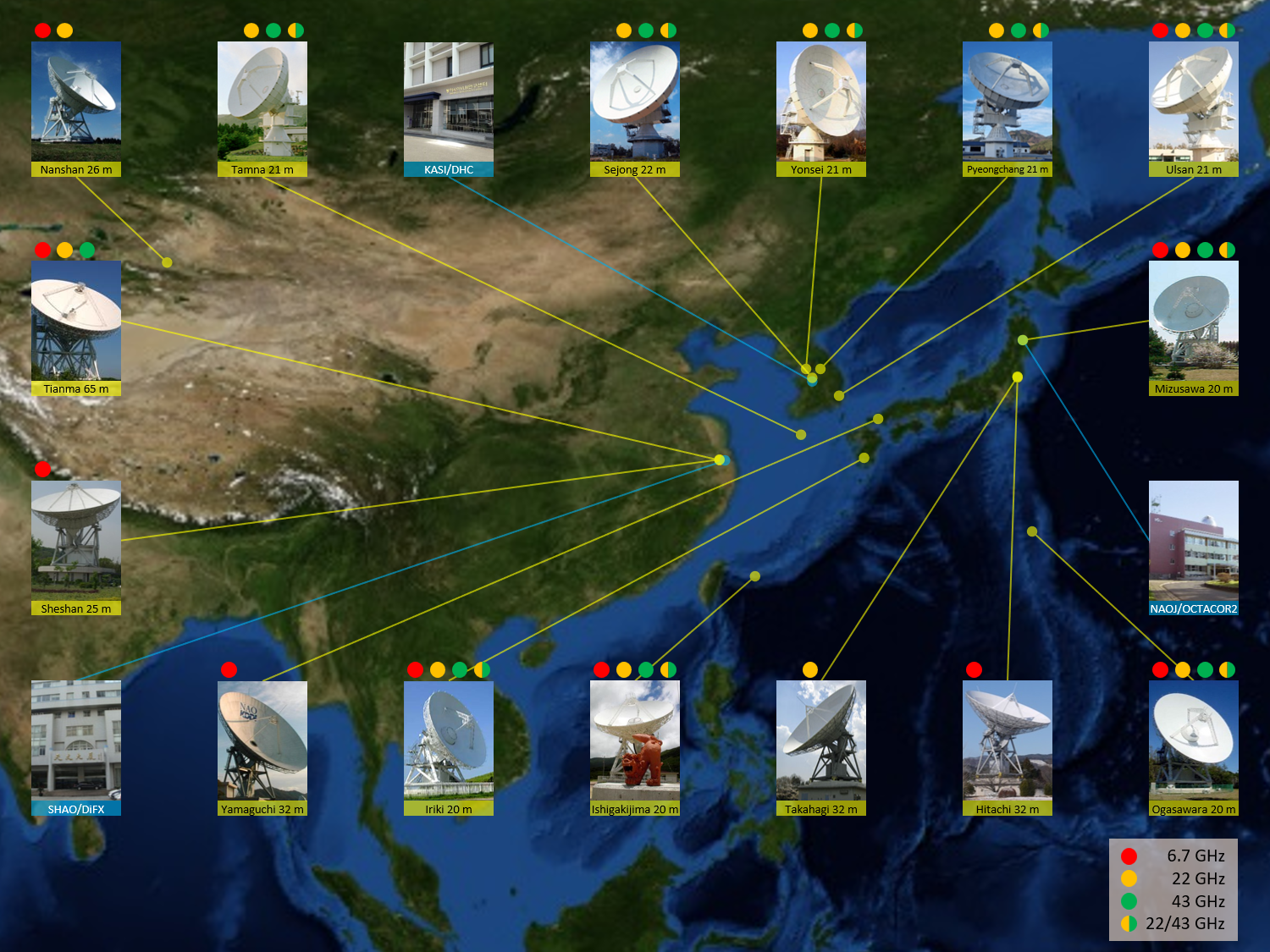 Now there are 4 stations in China, 12 stations in Japan and 3 stations in Korea, therefore the EAVN consists of 19 stations. The performance of each telescope (e.g. diameter and receivers) has variation, the EAVN is quite unique VLBI network in the world. Main observing wavelength is a centimeter which emits from star forming region, evolved star, X-ray binary and active galactic nuclei(AGNs).